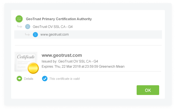 With an OV SSL Certificate, the identity of the company or organization that holds the certificate is validated, providing more trust for end users.