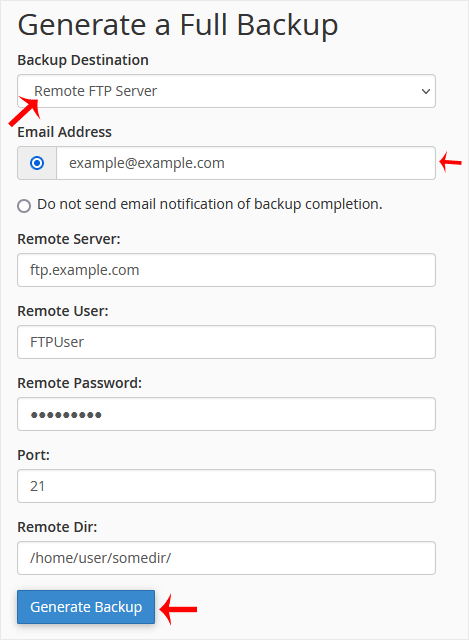 5. بعد إدخال تفاصيل FTP البعيدة، انقر على إنشاء نسخة احتياطية (Generate Backup).