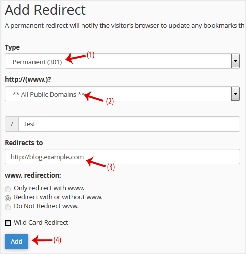 3. تحت إضافة إعادة توجيه (Add Redirect)، يجب عليك إدخال التفاصيل التالية واختيار الخيارات المناسبة: