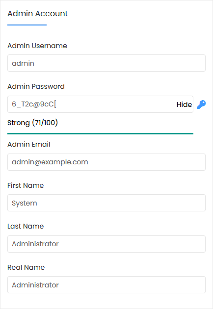 7. Under the Admin Account field, enter the following information: